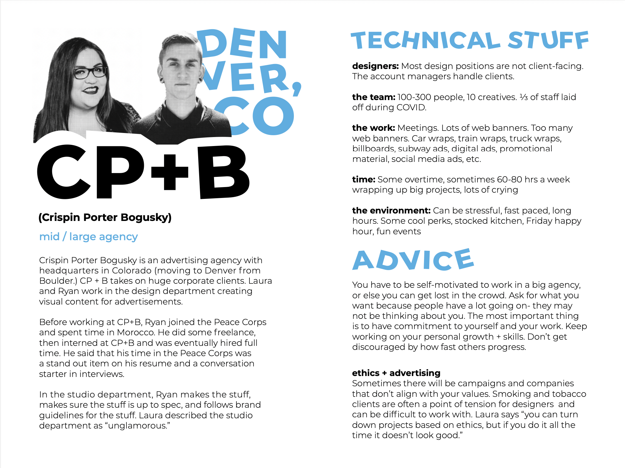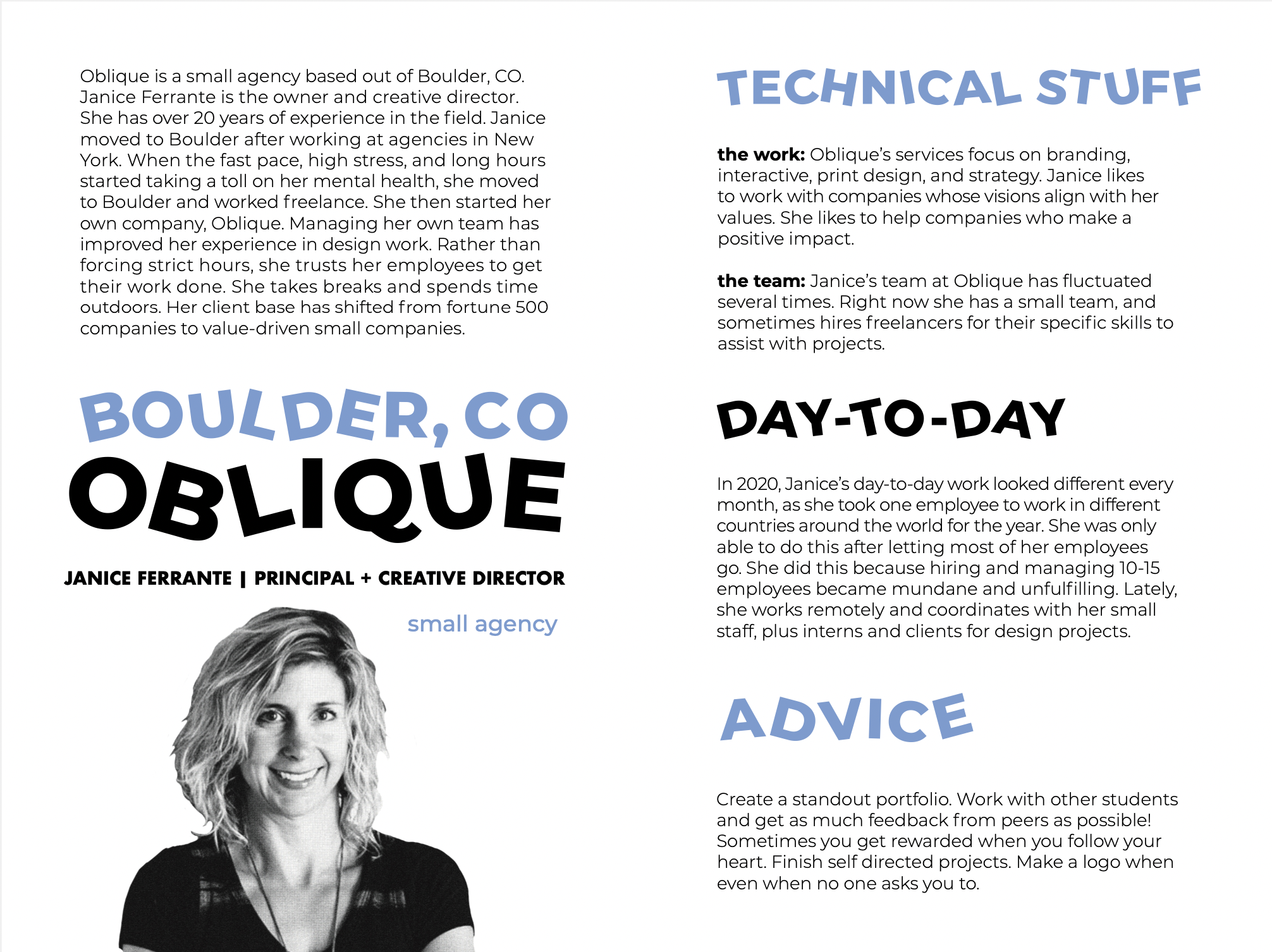 This digital zine was created as a way to compile information from a class called Professional Practices, in which we spoke to several professional designers working in different sized companies and doing different types of design.